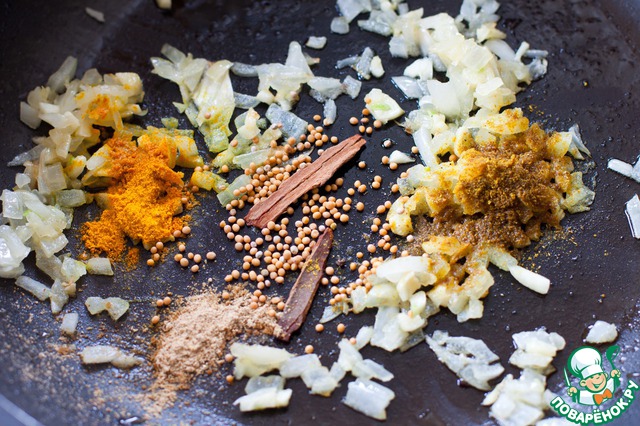 На другой сковороде раскалить 2 ст. л. растительного масла, обжарить лук и чеснок, потом добавить специи и готовить, помешивая, еще 2-3 минуты