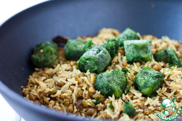 К рису и машу добавить специи со сковороды, перемешать, закрыть крышкой и готовить, пока рис не станет мягким. Добавить шпинат. Если шпинат замороженный, "закопать" его в рис, закрыть сковороду крышкой и подождать минут 5, пока он не оттает. Снять с огня. Если шпинат свежий, добавить, перемешать, накрыть крышкой и снять с оня.