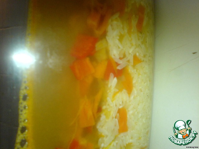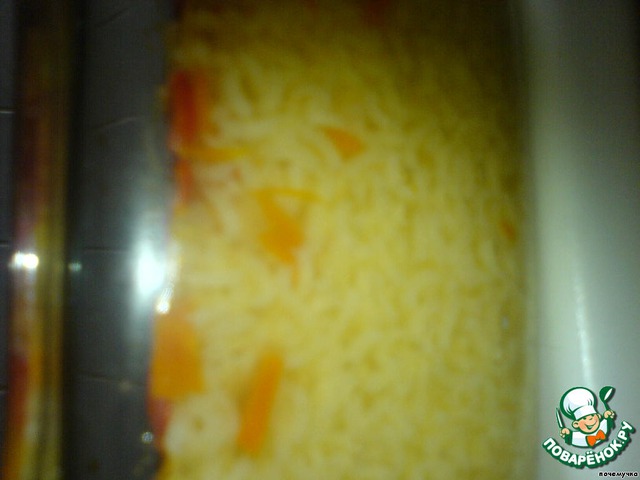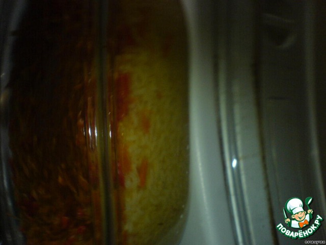 Я люблю готовить плов в духовке. Поэтому наши обжаренные овощи я переложила в чугунок /у меня чугунок стеклянный, как раз только для духовки, но не для печки/ сверху высыпала рис и залила кипящей водой.