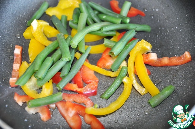 Стручковую фасоль предварительно бланшируем 1 минуту в кипятке, откидываем на дуршлаг. На сковороду, где жарилось тофу кладём стручковую фасоль, порезанный полосками красный и жёлтый болгарский перец, обжариваем 2 минуты.