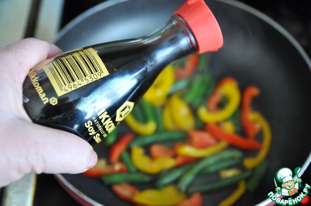 Добавляем к овощам соевый соус Kikkoman. Перемешиваем, тушим 1 минуту.