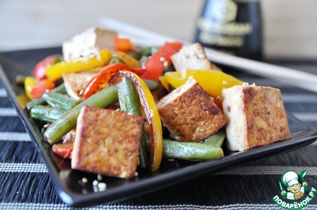| Если Вы не любите тофу, то Вы просто не умеете его готовить. Так как тофу - продукт, приготовленный из соевых бобов, то из него можно готовить различные блюда даже в дни самого строгого поста. Тофу уникален отсутствием вкуса и поэтому, какое получится блюдо из тофу - сладким, пряным, острым - полностью будет зависеть от вашей фантазии и примененных приправ. Предлагаю Вам вариант тофу с овощами в соевом соусе. |