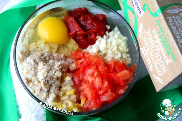 "Желтый" слой: добавляем в злаки яйцо, натертые на терке тыкву и морковь, нарезанный репчатый лук.