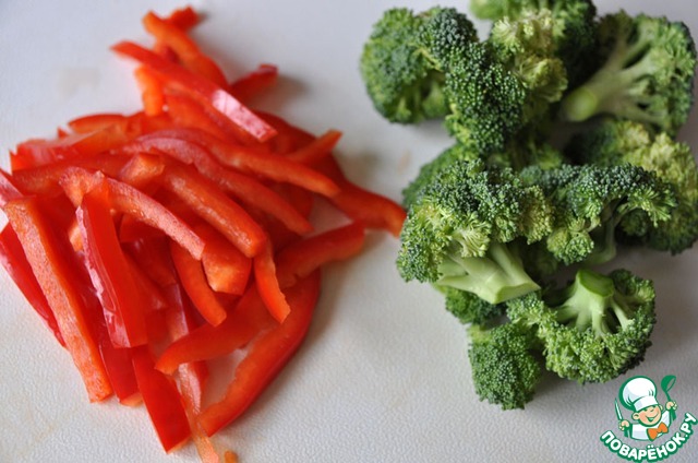 Брокколи разделяем на соцветия, красный болгарский перец нарезаем тонкими полосками.