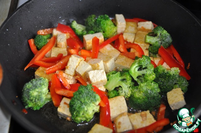 Добавляем тофу и обжариваем, помешивая, до хрустящей корочки.