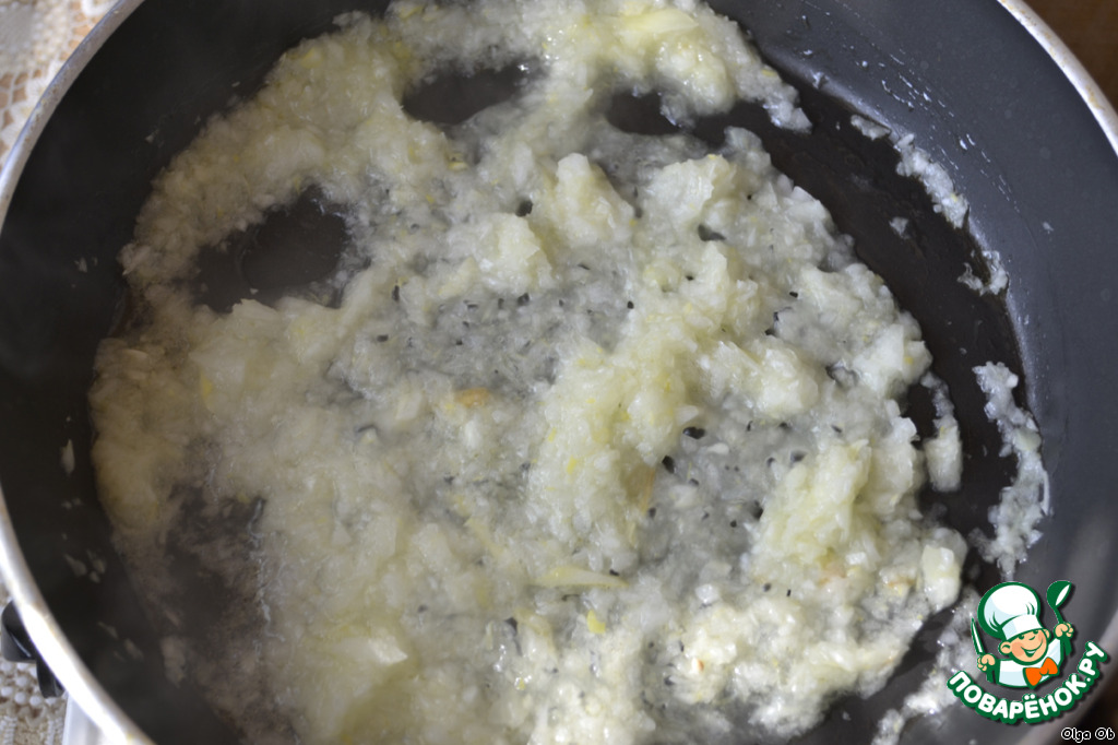 Очень мелко нарезать лук, я перемолола его в блендере, и выложить на разогретую сковороду с оливковым маслом.