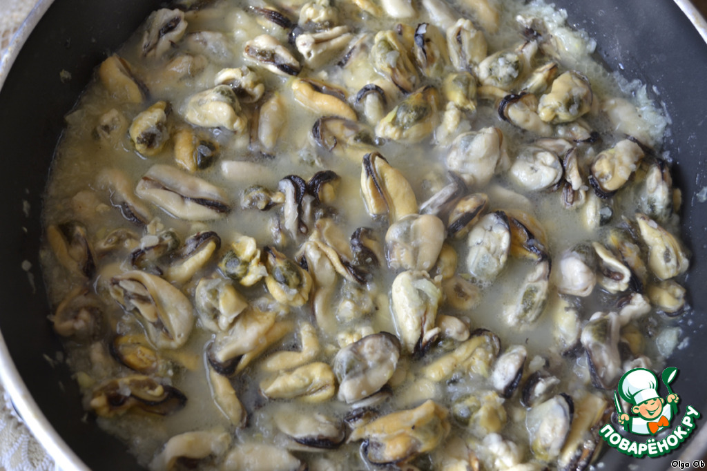 Мидии разморозить и хорошенько промыть, это очень важно, так как на них могут быть кусочки от раковин. Мидии выложить на сковороду и добавить немного воды.