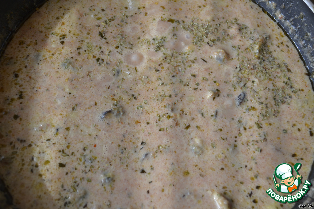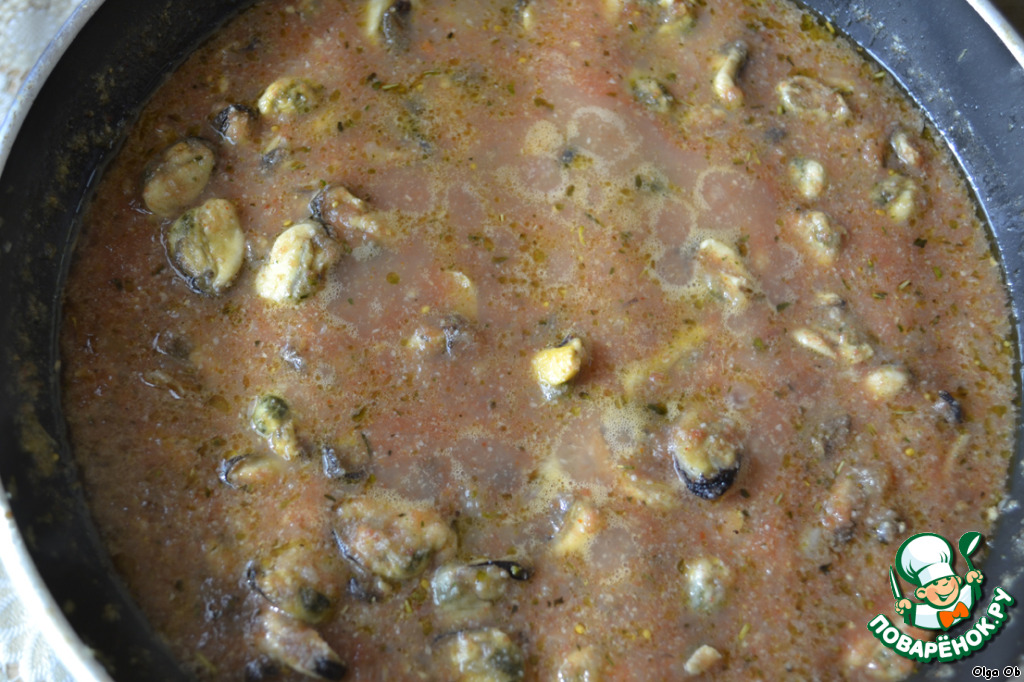 Сухое соевое молоко разбавить с 4 ст.л. горячей воды. Влить молочную смесь в мидии. Довести до кипения, накрыть крышкой и снять с огня.