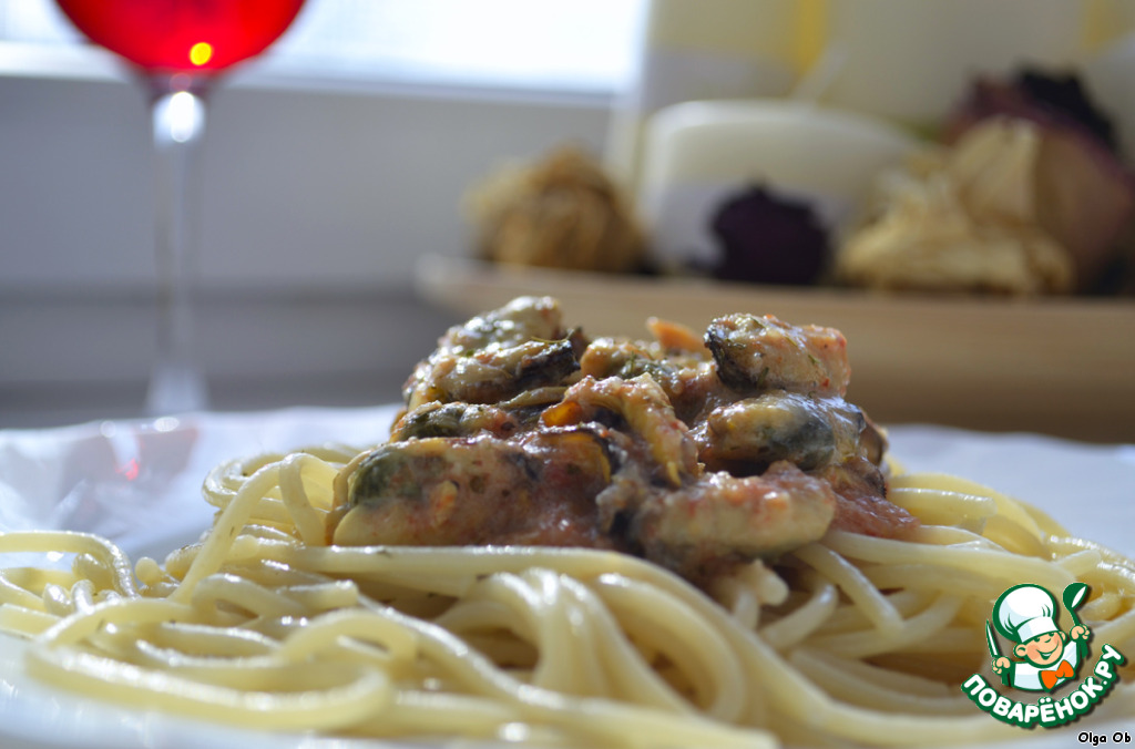 Варим спагетти. Я добавляю при варке чайную ложку оливкового масла. Макароны должны быть немного твердоватыми.