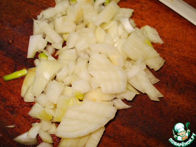 Лук обжарим в растительном масле. К обжаренному луку я добавляю проваренные грибы.