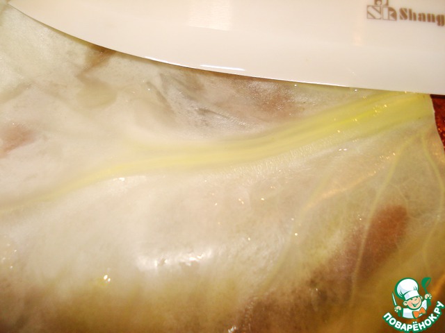 Из капусты нам необходимо вырезать кочерыжку и погружаем в кипящую воду. Когда капуста немного подварится, снимаем с нее листья. Утолщение у капустного листа срезаем ножом.