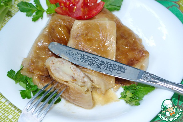 Можно приступать к сворачиванию капустного листа. Заворачиваем начинку в капустный лист.