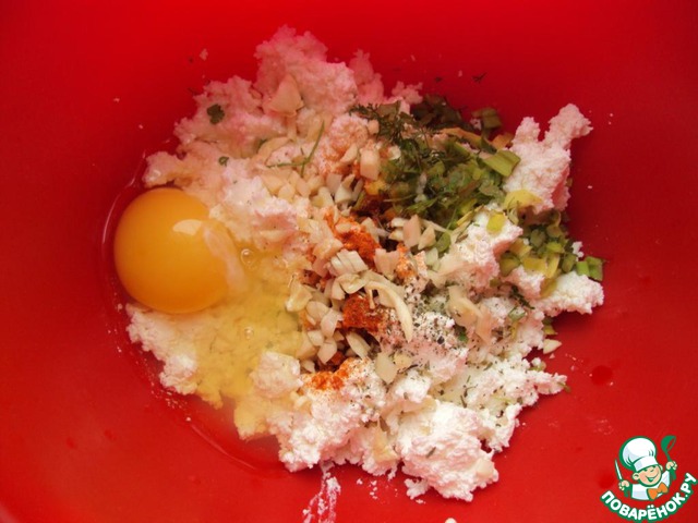 Добавить яйцо, чеснок, зелень, травы, соль и паприку в творог.