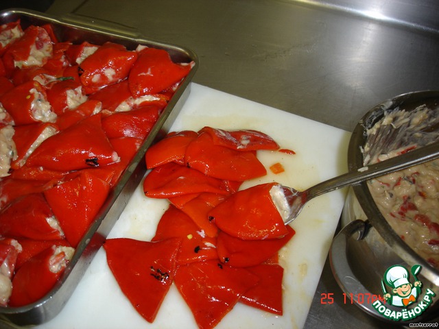 | В оригинале - "Pimientos del piquillo, rellenosde atun". Название piquillo происходит от слова пика, маленькие красные перчики по форме напоминают заостренную пику. Во время массовой уборки перчики обжигают на открытом огне, очищают от обгоревшей кожуры, вынимают семена и закрывают подготовленные таким образом перчики в банки в собственном соку. Дальнейшие действия предельно просты: открываем банку и делаем с заготовкой все, что угодно... |