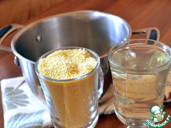 Для приготовления этого блюда нам понадобится кус-кус и овощной или куриный бульон. Кус-кус готовим так, как указанно на упаковке, использовав 1 стакан бульона и воду в качестве жидкости.