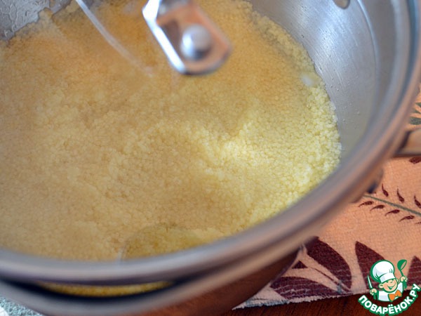 Бульон, воду и масло смешиваем в большой кастрюле и доводим до кипения. Добавляем кус-кус и снимаем кастрюлю с огня. Оставляем кус-кус под крышкой на 5 минут, чтобы он хорошо распарился.