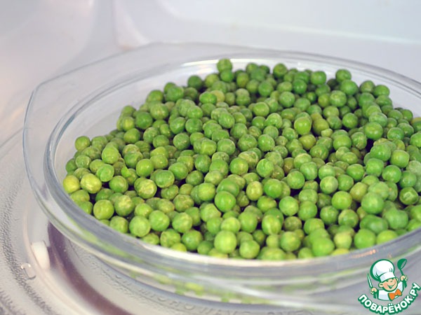 Зеленый горошек отвариваем или готовим в микроволновке так, как указано на упаковке.