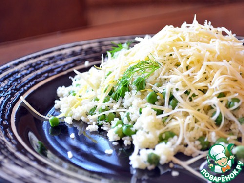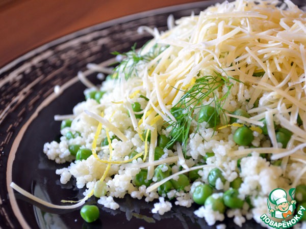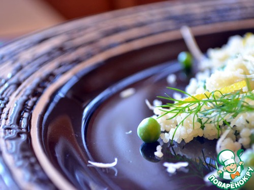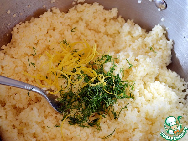 Кус-кус разрыхляем вилкой, добавляем укроп, свежую цедру лимона, соль и перец по вкусу.