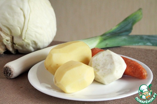 Картофель нарезать кубиками примерно 2*2 см., а сельдерей и морковь чуть мельче.