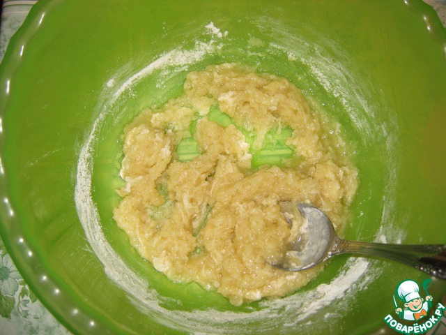 Добавляем половину муки, перемешиваем. Потом добавляем воду и оставшуюся часть муки и замешиваем тесто.