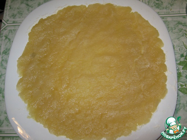 Кладём тесто на посыпанную мукой широкую плоскую тарелку и раскатываем его в лепёшку (я обычно это делаю аккуратно руками прямо на тарелке).