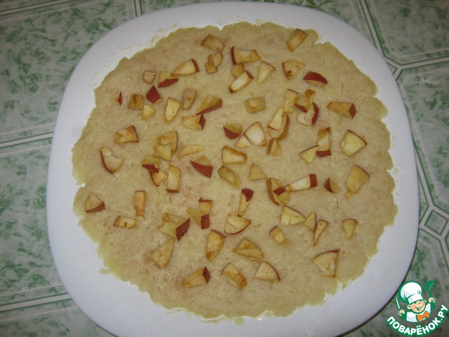 Режем яблоко на кусочки (можно предварительно почистить кожуру, а можно её оставить). Равномерно распределяем кусочки яблока по лепёшке и ставим тарелку в микроволновую печь. У меня максимальная мощность 700 Вт, я готовлю десерт 3,5-4 минуты (я делаю на 3,5 обычно, чтобы лепёшка была мягкой, можно есть ложечкой).