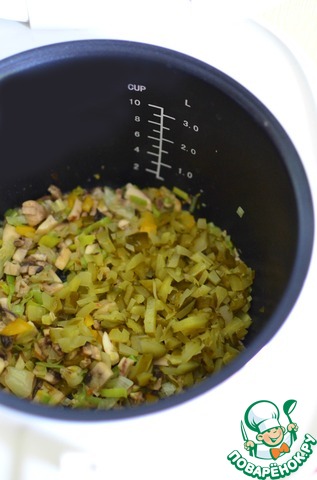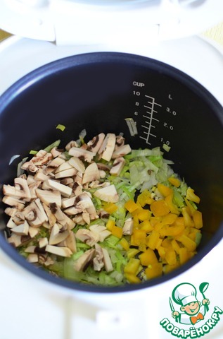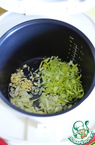 Порей, репчатый лук и чеснок нарезать и обжарить на масле в режиме Поджаривание. Далее добавляем все оставшиеся компоненты, обжаривая их по паре минут.