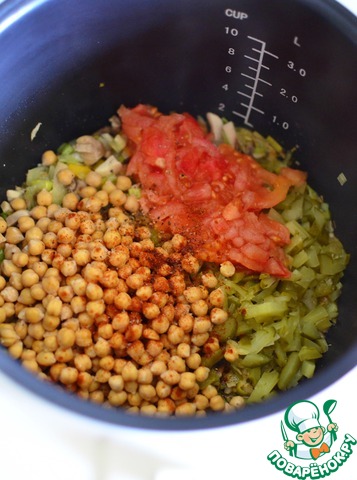 Добавить нут, помидор, очищенный от кожицы, лимонный сок, специи и соль по вкусу. Добавляем немного воды и переводим мультиварку в режим Тушение, пока не выпарится вся жидкость. В конце не забываем добавить нарезанную зелень.