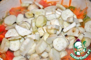 Помидор покрошить на небольшие кусочки (если нет помидор, можно взять 1 ст. л. томатной пасты и развести их в 100 мл воды) и добавить к жарящимся овощам, перемешать.