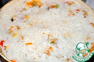 Отваренный до полуготовности рис выложить в сковороду поверх овощей. Если овощи суховатые, то добавить 2-3 столовые ложки кипяченой воды, если сочные, то просто укрыть крышкой и тушить еще 10-15 минут до готовности риса и овощей.