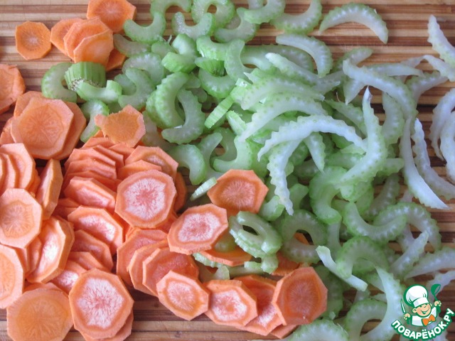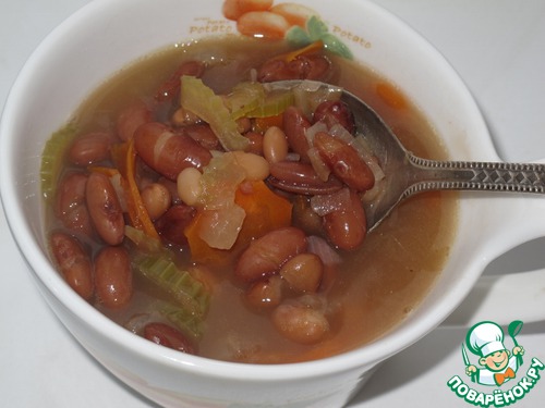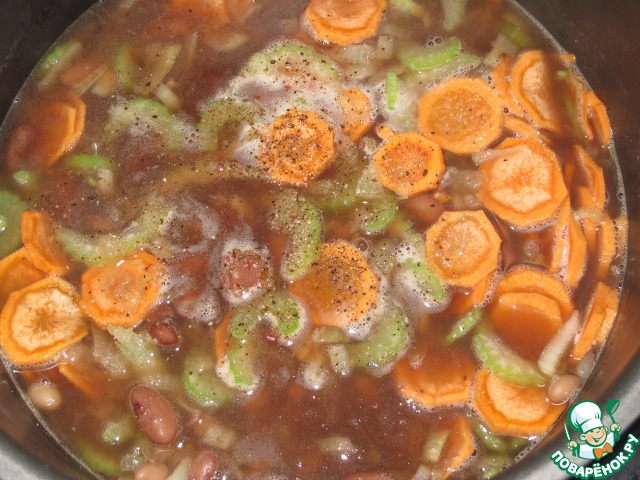 Лук, морковь, сельдерей, сахар, соль, перец добавить к фасоли и варить еще примерно 45 минут.