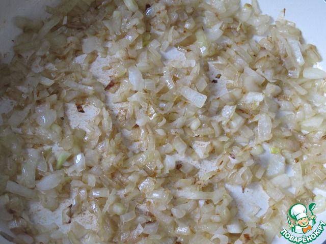 Пока фасоль варится, нарезать лук мелко и обжарить до прозрачности.
