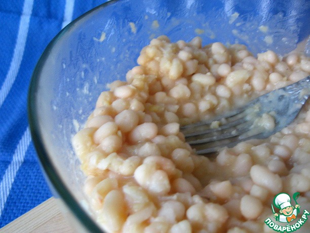 Добавить фасоль с чечевицей, смешать с маслом и вилкой размять, пока фасоль полностью не впитает соус.