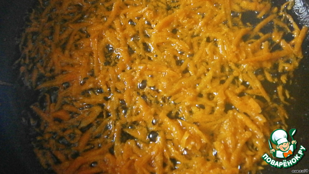 Добавляем лук к моркови и тушим минут 7 на маленьком огне.