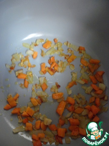 Нарезать лук и морковь кубиками. Нагреть мультиварку в режиме "Жарка" и обжарить их на масле, периодически помешивая.