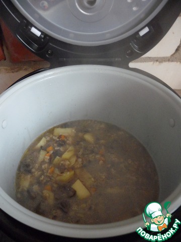 Залить горячей водой, добавить соль, лаврушку, перец. Включить мультиварку в режиме "Суп" на 30 минут. Через 15 минут добавить овсяные хлопья, перемешать и варить до готовности.