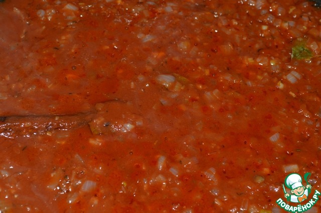 Лук и чеснок очистить и слегка обжарить на растительном масле. Добавить корицу, тимьян и лавровый лист и еще пожарить. Затем влиь томатный соус и тушить смесь на медленном огне 10 минут.