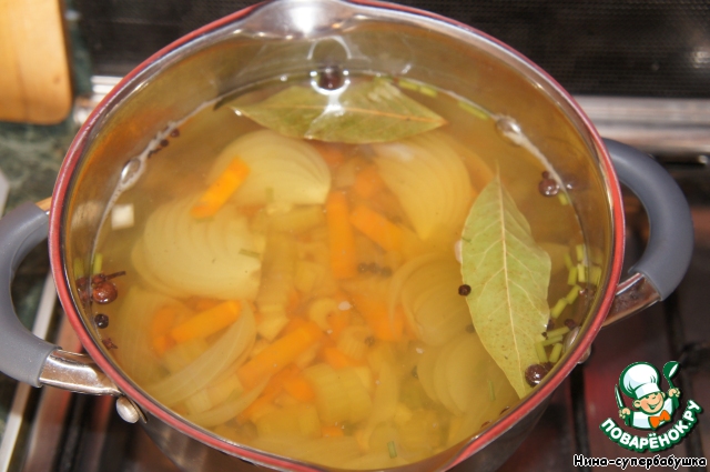Овощной бульон сварить заранее: в кастрюлю налить примерно 1,6-1,7 литра воды. Очистить 1 луковицу и 1 морковь, разрезать вдоль пополам и слегка подрумянить на сухой сковороде, затем нарезать дольками и опустить в воду. Добавить нарезанные кусочками 2 черешка сельдерея и кусочек корня сельдерея, нарезанный кубиками. На среднем огне довести воду до кипения и варить на слабом огне минут 40. Затем добавить щепотку черного перца горошком, несколько душистых перчиков, 2 гвоздички и 2 лаврушки. Варить еще минут 10-15. Затем бульон процедить через марлю, овощи хорошо отжать. Они нам не понадобятся.