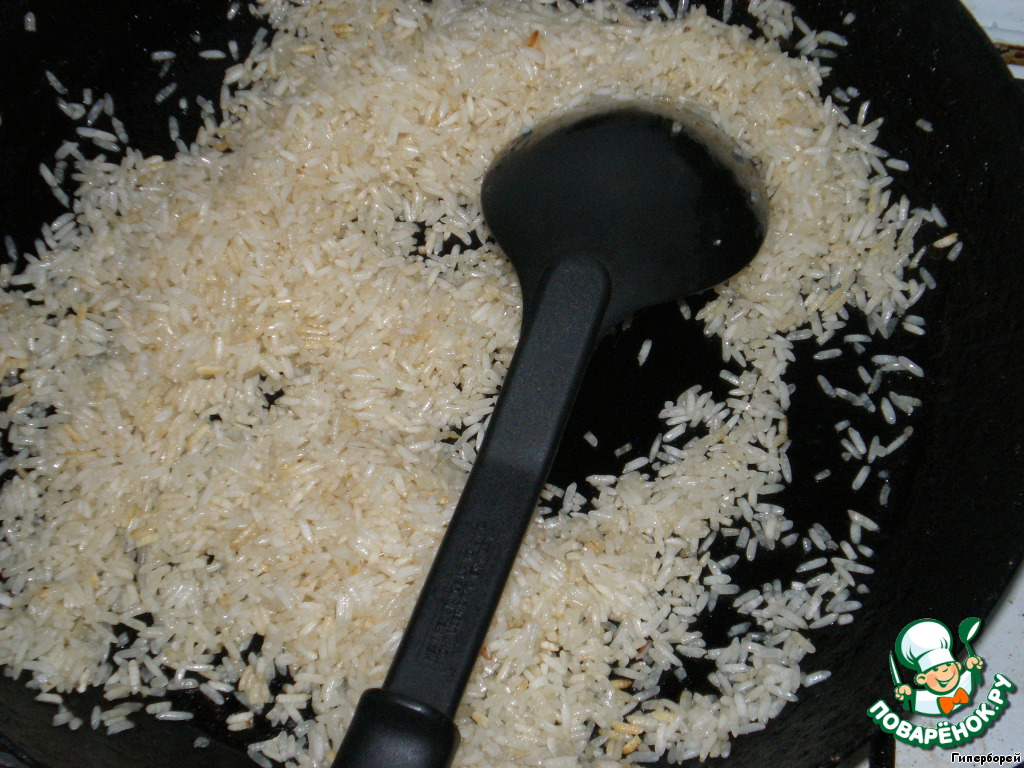 Промытый и замоченный рис высыпать на промасленную сковороду и поджарить.