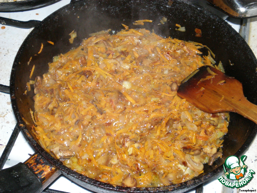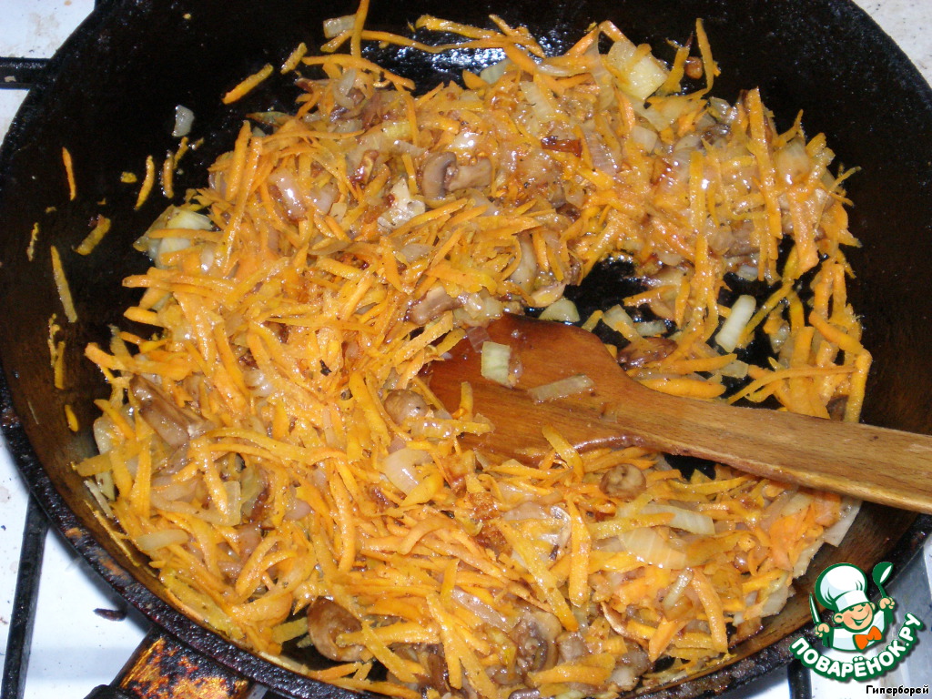 Когда лук подрумянится, добавить натертую на крупной терке или нарезанную соломкой морковь и, постоянно помешивая, продолжать жарить.