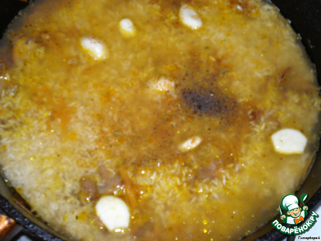 Когда рис набухнет, содержимое посолить, поперчить и перемешать.