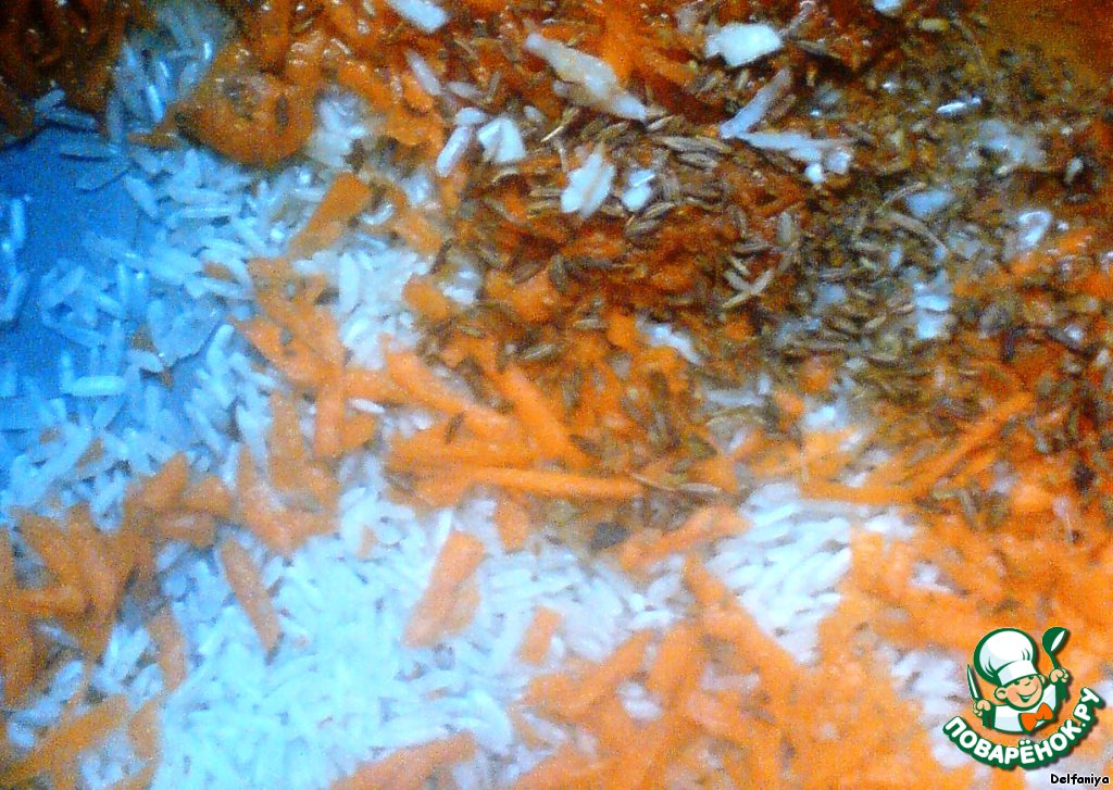 Смешаем ее в кастрюле вместе с рисом, измельченным чесноком и пряностями. Варить рис как обычно, почти до готовности, в конце добавить две столовые ложки соевого соуса.