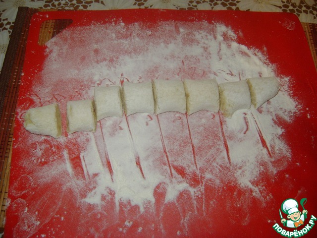 Из теста раскатать колбаски толщиной примерно 2 см и нарезать клёцки небольшой ширины.