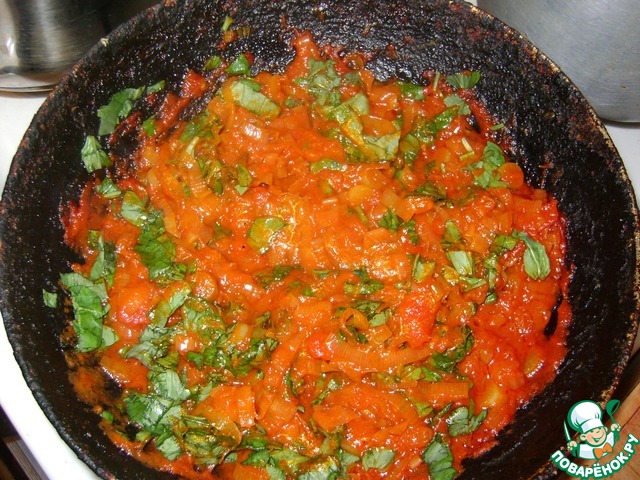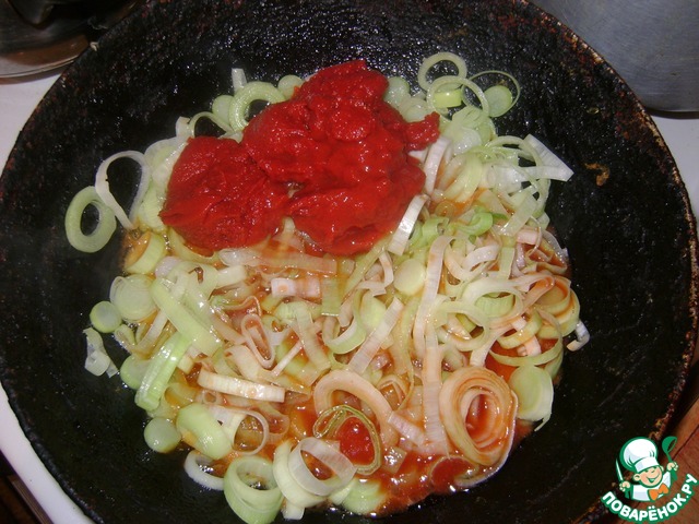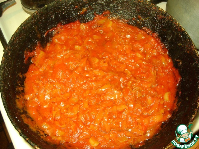 Обжарить его на растительном масле. Добавить томатную пасту, сок от помидоров, посолить по вкусу.