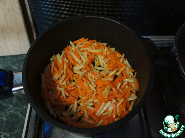 Морковь и корень сельдерея спасссеровать на растительном масле до полуготовности.