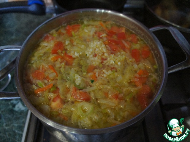 Добавить капусту и перец, посолить и варить еще 5 минут.