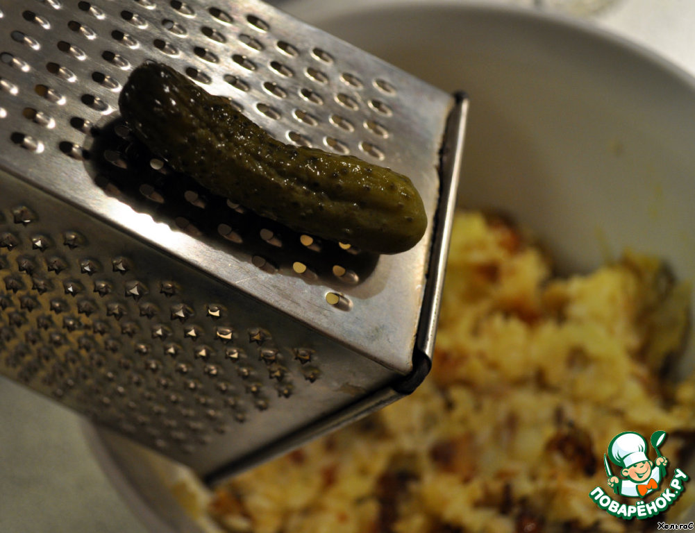 Для пикантности натрём соленые огурчики - если маленькие, то 3 штуки, если большой, то 1 - по вкусу