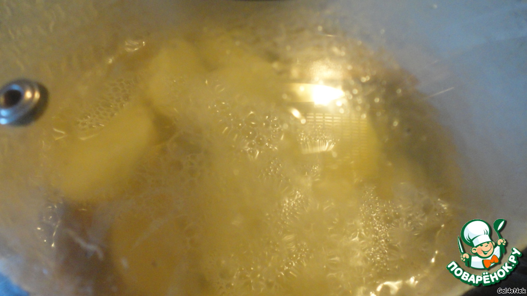 Заливаем кипятком и варим на медленном огне БЕЗ СОЛИ почти до готовности. Когда картофель практически готов, подсаливаем и довариваем.
