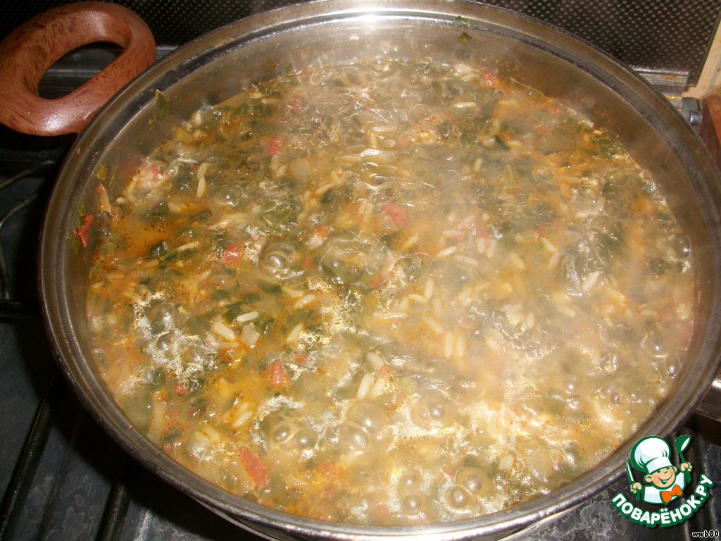Промытый рис, соль и перец добавить в сотейник с луком и помидорами. Залить водой и варить 10 минут (время примерное.Зависит от сорта риса). Затем добавить шпинат и варить ещё 10 минут.