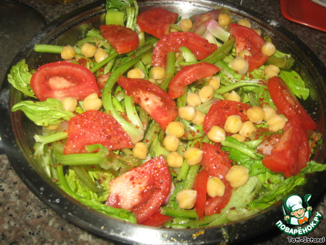 Помидоры пластинками. Сверху поливаем маслом, посыпаем солью и красным перцем. Сахар растворяем в лимоном соке и поливаем сверху. И в конце посыпаем нутом. На среднем огне без крышки тушим 5 минут. Потом добавляем воду и закрываем крышкой. Тушим 25-30 минут на маленьком огне.